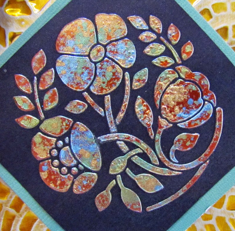 Double Sided Mounting Paper. I pressed red, gold and copper foils in the exposed areas using my fingers and the
